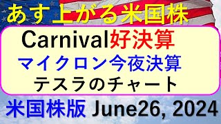 米国株の株式投資。Carnivalが好決算。マイクロンテクノロジーは今夜決算発表。テスラのチャート~あす上がる株 米国版June 26, 2024~最新のアメリカ株価と株式投資。高配当株