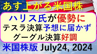 米国株の株式投資。ハリス氏がトランプ氏をリード、アメリカ大統領選。テスラとアルファベットの決算~あす上がる株米国版July 24, 2024。最新のアメリカ株価と株式投資。高配当株やデイトレ情報も