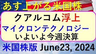 米国株の株式投資。マイクロンが決算。クアルコム、エヌビディア、アップル、クラウドストライク、ブロードコム、テスラ~あす上がる株 米国版June 23, 2024~最新のアメリカ株価と株式投資。高配当株