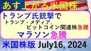 米国株の株式投資。トランプ氏銃撃でトランプ・メディアやビットコイン関連銘柄、マラソン・デジタル~あす上がる株米国版July 16, 2024。最新のアメリカ株価と株式投資。高配当株やデイトレ情報も