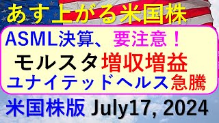 米国株の株式投資。ASMLの決算に要注意。ユナイテッドヘルスとモルガンスタンレーが決算で上昇。~あす上がる株米国版July 17, 2024。最新のアメリカ株価と株式投資。高配当株やデイトレ情報も