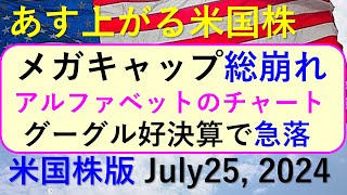 米国株の株式投資。テスラとアルファベットだけでなく、メガキャップがセクターローテーションで総崩れ。~あす上がる株米国版July 25, 2024。最新のアメリカ株価と株式投資。高配当株やデイトレ情報も