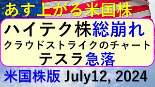 米国株の株式投資。CPI発表でハイテク株下落。テスラのロボタクシー延期。クラウドストライクの株価~明日上がる株米国版July 12, 2024。最新のアメリカ株価と株式投資。高配当株やデイトレ情報も
