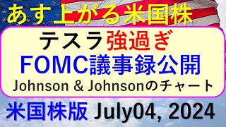 米国株の株式投資。テスラが強い。FOMC議事録公開。ジョンソン & ジョンソンのチャートJNJ~明日上がる株米国版July 4, 2024。最新のアメリカ株価と株式投資。高配当株やデイトレ情報も