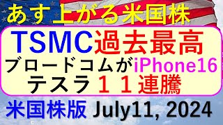米国株の株式投資。TSMCが最高売上。ブロードコムiPhone。テスラ11連騰。デルタ航空が決算~明日上がる株米国版July 11, 2024。最新のアメリカ株価と株式投資。高配当株やデイトレ情報も