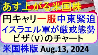 米国株の株式投資。円キャリートレードは一服。イスラエルとイランとヒズボラの緊張、ビザの株価推移~あす上がる株米国版。Aug. 13, 2024。最新のアメリカ株価と株式投資。高配当株やデイトレ情報も