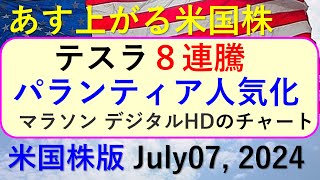 米国株の株式投資。テスラが8連騰。パランティアが人気化。マラソン デジタル の株価チャート~明日上がる株米国版July 7, 2024。最新のアメリカ株価と株式投資。高配当株やデイトレ情報も