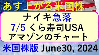 米国株の株式投資。ナイキ急落。アマゾンの業績推移と株価チャート。くら寿司USA~あす上がる株 米国版June 30, 2024~最新のアメリカ株価と株式投資。高配当株やデイトレ情報も