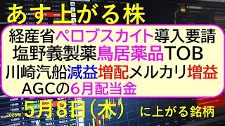 あす上がる株 2025年5月8日(木)に上がる銘柄。経産省がペロブスカイト太陽電池の導入要請。川崎汽船は減益増配。メルカリ増益。塩野義が鳥居薬品TOB~最新の日本株情報。高配当株の株価やデイトレ情報~