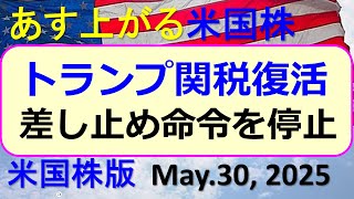 米国株の株式投資情報。トランプ関税復活。差し止め命令を停止。~あす上がる株米国版。May.30, 2025。最新のアメリカ株価と株式投資。高配当株やデイトレ情報も