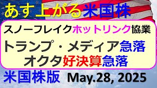 米国株の株式投資情報。トランプ・メディア急落。スノーフレイク日本ホットリンク協業。オクタ好決算急落~あす上がる株米国版。May.28, 2025。最新のアメリカ株価と株式投資。高配当株やデイトレ情報も