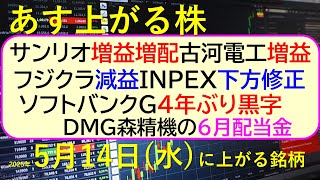 あす上がる株 2025年5月14日(水)に上がる銘柄。サンリオ増益・増配。古河電工増益。フジクラ減益。INPEX下方修正。ソフトバンクG黒字~最新の日本株情報。高配当株の株価やデイトレ情報~
