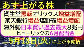 あす上がる株 2025年5月13日(火)に上がる銘柄。資生堂黒転。オリックス増益増配。楽天銀行増益、塩野義増益増配。海外勢日本買8兆。ヒューリック配当~最新の日本株情報。高配当株の株価やデイトレ情報~