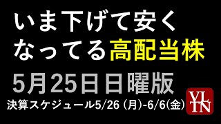 いま下げて安くなってる高配当株。決算スケジュール2週間分。5/25日曜版~あす上がる株。最新の日本株情報。高配当株の株価やデイトレ情報も~