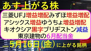 あす上がる株 2025年5月16日(金)に上がる銘柄。三菱UFJ増益。みずほ増益。アシックス増益。ゆうちょ増益増配。キオクシア黒字。ブリヂストン減益~最新の日本株情報。高配当株の株価やデイトレ情報~
