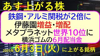 あす上がる株 2025年6月3日(火)に上がる銘柄。伊藤園増益・増配。メタプラネット世界10位に。鉄鋼・アルミ関税が2倍に。横浜ゴムの6月配当金。~最新の日本株情報。高配当株の株価やデイトレ情報~