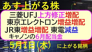 あす上がる株 2025年5月1日(木)に上がる銘柄。三菱UFJ上方修正増配。東京エレクトロン増益増配。JR東増益増配。東電減益。キャノンの6月配当金~最新の日本株情報。高配当株の株価やデイトレ情報~