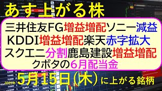 あす上がる株 2025年5月15日(木)に上がる銘柄。三井住友FG増益増配。スクエニ分割。KDDI増益増配。楽天赤字拡大。鹿島建設増益増配。ソニー減益~最新の日本株情報。高配当株の株価やデイトレ情報~