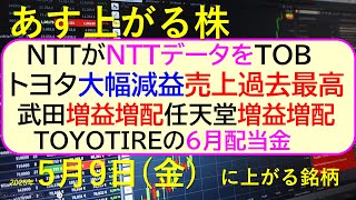あす上がる株 2025年5月9日(金)に上がる銘柄。NTTがNTTデータをTOB。トヨタ大幅減益だが売上は過去最高。武田は増益増配、任天堂は増益増配。~最新の日本株情報。高配当株の株価やデイトレ情報~