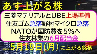 あす上がる株 2025年5月19日(月)に上がる銘柄。三菱マテリアルとUBE上場準備。住友ゴム急落。野村マイクロ急落。NATO国防費5%。住友林業配当~最新の日本株情報。高配当株の株価やデイトレ情報~