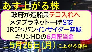 あす上がる株 2025年5月26日(月)に上がる銘柄。政府が造船業テコ入れへ。メタプラネット一時S安。IRジャパンにインサイダー容疑。キリンHDの配当~最新の日本株情報。高配当株の株価やデイトレ情報~