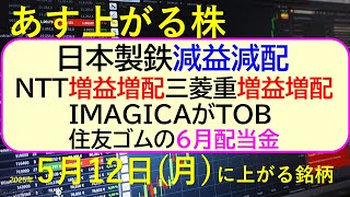 あす上がる株 2025年5月12日(月)に上がる銘柄。日本製鉄が減益減配。NTTは増益増配。三菱重工は増益増配。IMAGICAがTOB。住友ゴムの配当~最新の日本株情報。高配当株の株価やデイトレ情報~