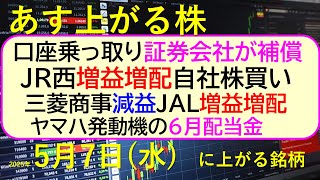 あす上がる株 2025年5月7日(水)に上がる銘柄。証券口座乗っ取り、証券会社が補償。三菱商事減益。JAL増益増配。JR西増益増配自社株。ヤマハ発動機~最新の日本株情報。高配当株の株価やデイトレ情報~