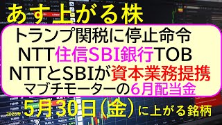 あす上がる株 2025年5月30日(金)に上がる銘柄。トランプ関税に停止命令。NTT住信SBI銀行TOB。NTTSBI資本業務提携。マブチモーター配当~最新の日本株情報。高配当株の株価やデイトレ情報~