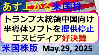 米国株の株式投資情報。エヌビディアが好決算。トランプ大統領が中国向け半導体ソフトを提供停止~あす上がる株米国版。May.29, 2025。最新のアメリカ株価と株式投資。高配当株やデイトレ情報も