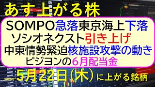 あす上がる株 2025年5月22日(木)に上がる銘柄。SOMPO急落、東京海上下落。ソシオネクスト引き上げ。中東情勢緊迫、核施設攻撃へ。ピジヨン配当~最新の日本株情報。高配当株の株価やデイトレ情報~
