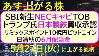 あす上がる株 2025年5月27日(火)に上がる銘柄。SBI新生銀NECキャピTOB。トランプ氏日本製鉄承認。リミックスポイントBTC購入。日清紡配当~最新の日本株情報。高配当株の株価やデイトレ情報~