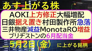 あす上がる株 2025年5月2日(金)に上がる銘柄。AOKI上方大幅増配。日銀据え置き。村田急落。三井物産減益。MonotaRO増益。ブリヂストン配当~最新の日本株情報。高配当株の株価やデイトレ情報~