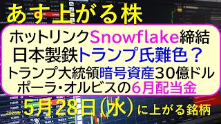 あす上がる株 2025年5月28日(水)に上がる銘柄。ホットリンクがSnowflakeと締結。日本製鉄トランプ氏難色?トランプ大統領暗号資産30億ドル~最新の日本株情報。高配当株の株価やデイトレ情報~
