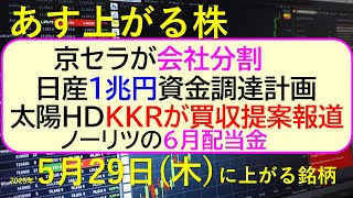 あす上がる株 2025年5月29日(木)に上がる銘柄。京セラが会社分割。日産が1兆円資金調達計画。太陽HDはKKRが買収提案報道。ノーリツの6月配当金~最新の日本株情報。高配当株の株価やデイトレ情報~