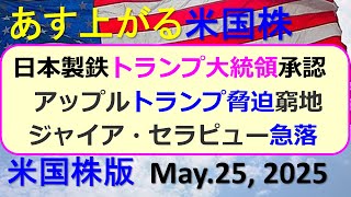 米国株の株式投資情報。日本製鉄、トランプ大統領承認。アップルにトランプ脅迫。ジャイアセラピュー急落~あす上がる株米国版。May.25, 2025。最新のアメリカ株価と株式投資。高配当株やデイトレ情報も