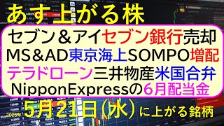 あす上がる株 2025年5月21日(水)に上がる銘柄。セブン&アイがセブン銀行売却。MS&AD、東京海上、SOMPO決算。テラドローン三井物産米国合弁~最新の日本株情報。高配当株の株価やデイトレ情報~
