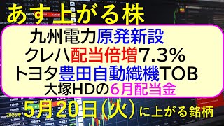 あす上がる株 2025年5月20日(火)に上がる銘柄。九州電力が原発新設。クレハ配当倍増。トヨタ豊田自動織機TOB。大塚HDの6月配当金。~最新の日本株情報。高配当株の株価やデイトレ情報~