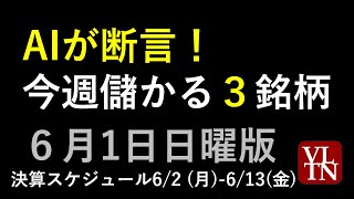 AIが断言!今週儲かる3銘柄。決算スケジュール2週間分。6月1日日曜版~あす上がる株。最新の日本株情報。高配当株の株価やデイトレ情報も~