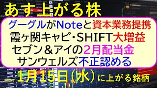 あす上がる株 2025年1月15日(水)に上がる銘柄。グーグルがNoteと資本業務提携。霞ヶ関キャピタルとSHIFTが大増益。サンウェルズが不正認める~最新の日本株情報。高配当株の株価やデイトレ情報~