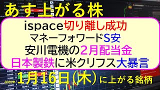 あす上がる株 2025年1月16日(木)に上がる銘柄。ispace切り離し成功。日本製鉄に米クリフス大暴言。マネーフォワードS安。安川電機の2月配当金~最新の日本株情報。高配当株の株価やデイトレ情報~