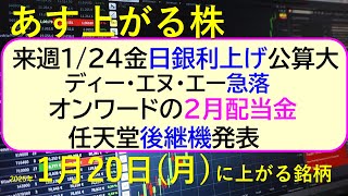 あす上がる株 2025年1月20日(月)に上がる銘柄。来週1/24金曜は日銀利上げ公算大。任天堂後継機発表。ディー・エヌ・エー急落。オンワード配当金。~最新の日本株情報。高配当株の株価やデイトレ情報~