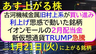 あす上がる株 2025年1月21日(火)に上がる銘柄。旧村上系が古河機械金属買い進み。利上げ思惑で動いた銘柄。仮想通貨TRUMP。イオンモール配当金~最新の日本株情報。高配当株の株価やデイトレ情報~