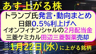あす上がる株 2025年1月22日(水)に上がる銘柄。トランプ氏の発言と動向。日銀0.5%利上げ。三菱ケミカルが売却。イオンフィナンシャル配当金~最新の日本株情報。高配当株の株価やデイトレ情報~