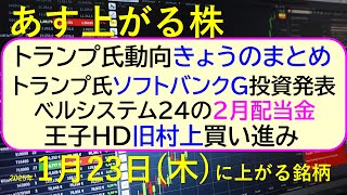 あす上がる株 2025年1月23日(木)に上がる銘柄。トランプ大統領とソフトバンクGがスターゲート発表。王子HD旧村上が買い進み。トランプ氏動向まとめ~最新の日本株情報。高配当株の株価やデイトレ情報~