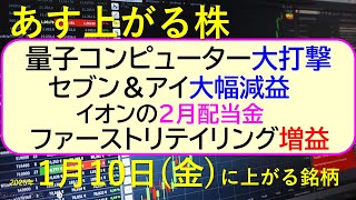 あす上がる株 2025年1月10日(金)に上がる銘柄。量子コンピューター大打撃。セブン&アイ大幅減益。ファーストリテイリング増益。イオンの2月配当金。~最新の日本株情報。高配当株の株価やデイトレ情報~