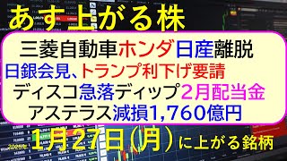 あす上がる株 2025年1月27日(月)に上がる銘柄。日銀会見。トランプ氏利下げ要請。アステラス下方修正。三菱自、ホンダ・日産離脱離脱。ディスコ急落~最新の日本株情報。高配当株の株価やデイトレ情報~