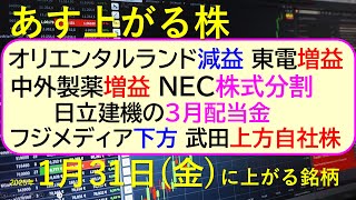 あす上がる株 2025年1月31日(金)に上がる銘柄。オリエンタルランド減益、東電増益、フジメディア下方、武田薬品上方、中外製薬増益、NEC株式分割~最新の日本株情報。高配当株の株価やデイトレ情報~