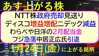 あす上がる株 2025年1月24日(金)に上がる銘柄。NTT株は政府売却見送り。ディスコ増益増配、ニデック減益。フジ急落中居正広氏引退。~最新の日本株情報。高配当株の株価やデイトレ情報~