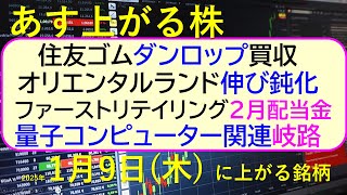 あす上がる株 2025年1月9日(木)に上がる銘柄。住友ゴムがダンロップ買収。オリエンタルランドが伸び鈍化。量子コンピューター関連は岐路か?~最新の日本株情報。高配当株の株価やデイトレ情報~