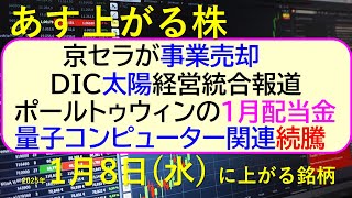 あす上がる株 2025年1月8日(水)に上がる銘柄。京セラが事業売却。DICと太陽HD経営統合報道。量子コンピューター関連が続騰。ポールトゥウィン配当~最新の日本株情報。高配当株の株価やデイトレ情報~
